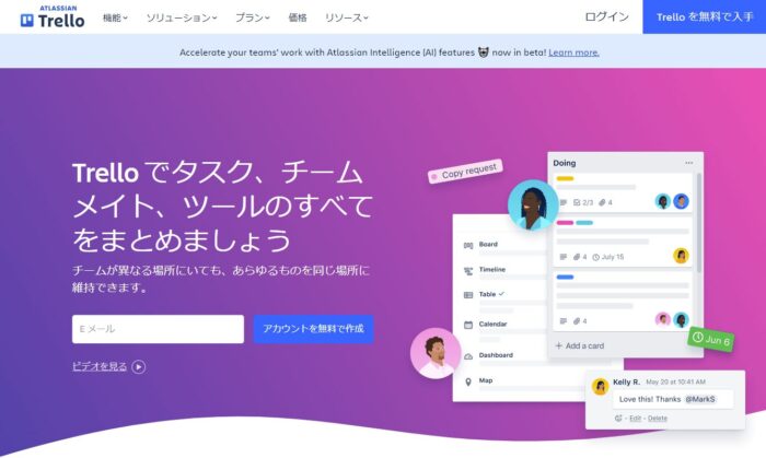 Trelloは、Microsoft 365アプリのPlannerと同様に、かんばん方式で視覚的にチームのタスク管理が行えるツールです。