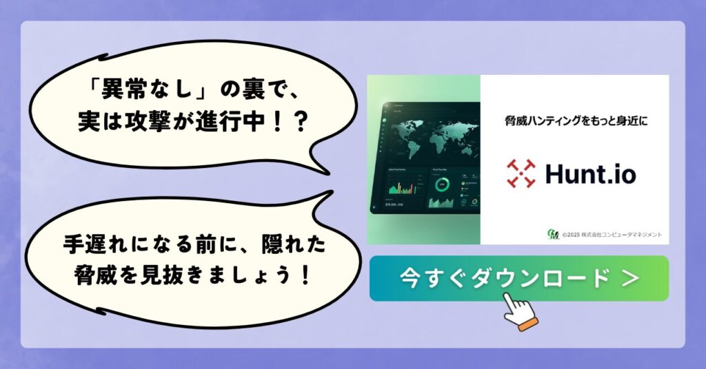 従来の製品では「異常なし」と判断されがちな攻撃にも対応できる新しい視点を取り入れ、組織のセキュリティレベルをもう一段階引き上げたい企業様は、ぜひHunt.ioの導入をご検討ください。
